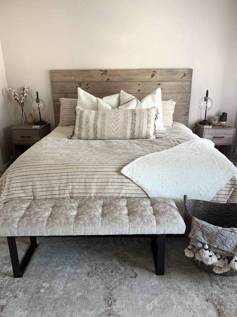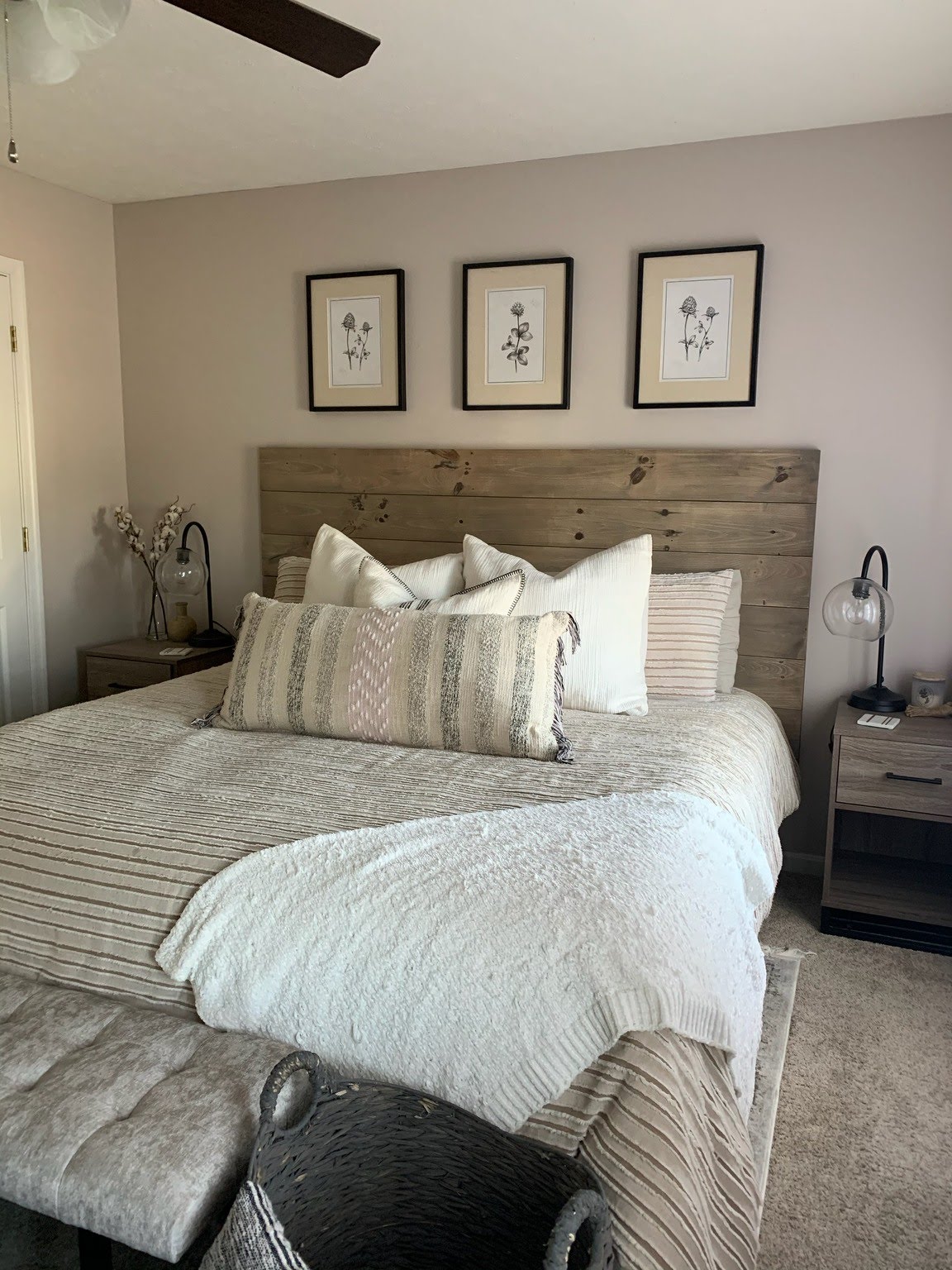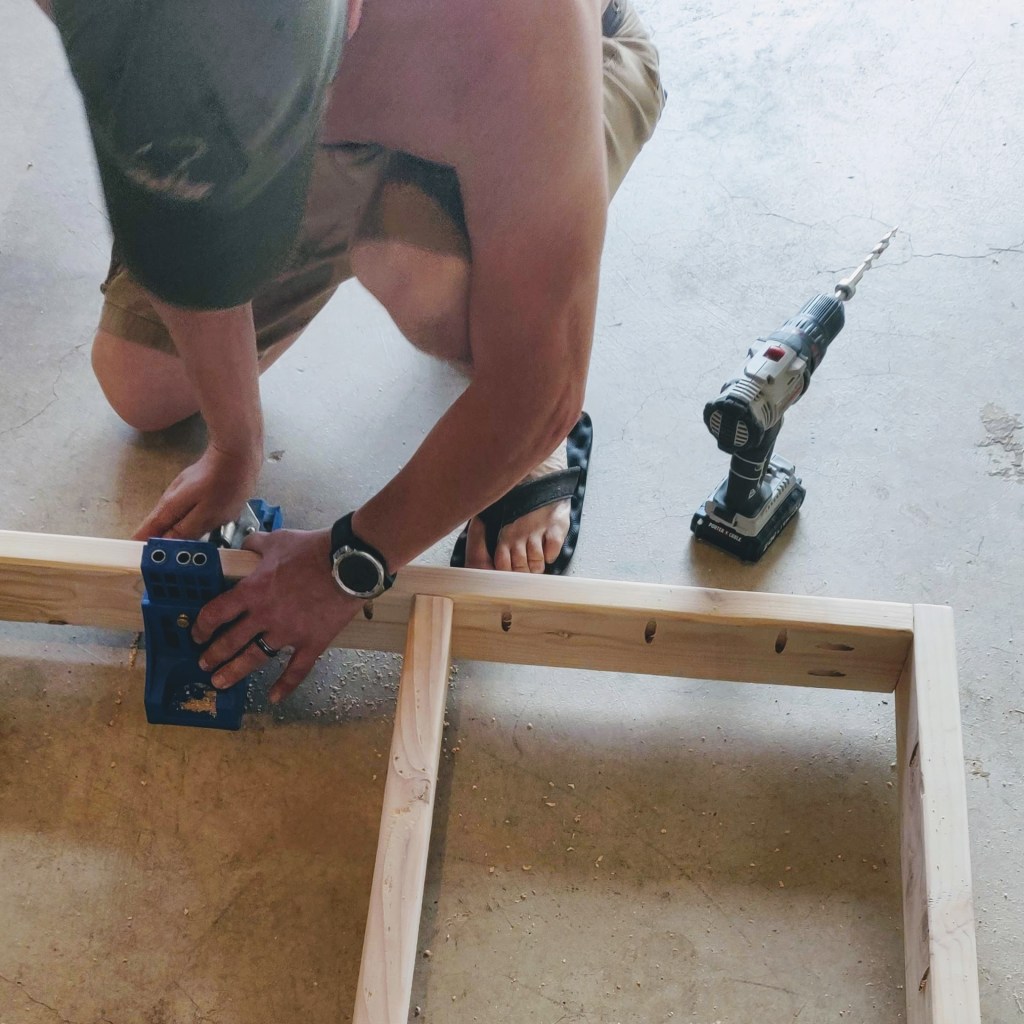 My daughter and her boyfriend have been redecorating their bedroom…well she’s redecorating, he’s just a great guy that knows making her happy is important, we love him for this! In her quest to redecorate she had been struggling to find a new bed that matched her boho/farmhouse style and would also match the dressers and nightstands she had already purchased. She was wanting something big enough to accommodate their king size bed but not too big that she couldn’t showcase artwork above the bed. So mom and stepdad to the rescue! We told them we had no problem making it for them…but they had to help out!