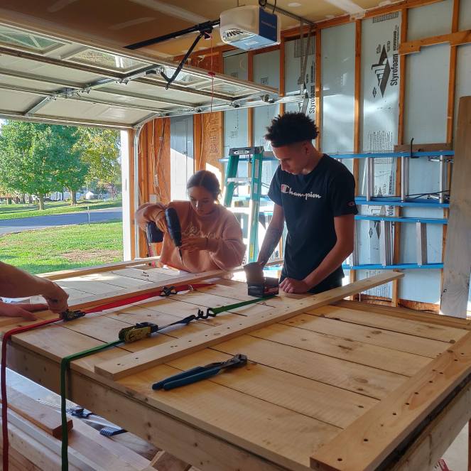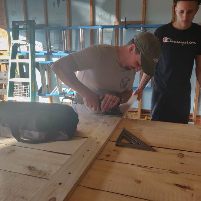 We decided to make the headboard using pine 8 inch shiplap and pine 1 x 4’s. We cut the shiplap to the length she wanted (84 1/2 inches) this size would give them about 4 1/2 inches of overhang on each side. Then for height she wanted approximately 4 feet up from the top of her bed frame, due to the width of the shiplap and wanting to keep all of the boards the same we ended up being between 47 and 48 inches tall which still worked out perfectly. As you can see we put them to work! They both got to use the miter saw for the first time, which is always a fun experience! Not shown are pics of the staining trial and errors, trying to match a non wood surface was not easy, but we got as close as we could! We stained all of the boards before assembling using an Antique White base stain and Jacobean stain on top with several coats. We attached the shiplap to the 1 x 4’s from the back so there wouldn’t be any screw holes to fill.