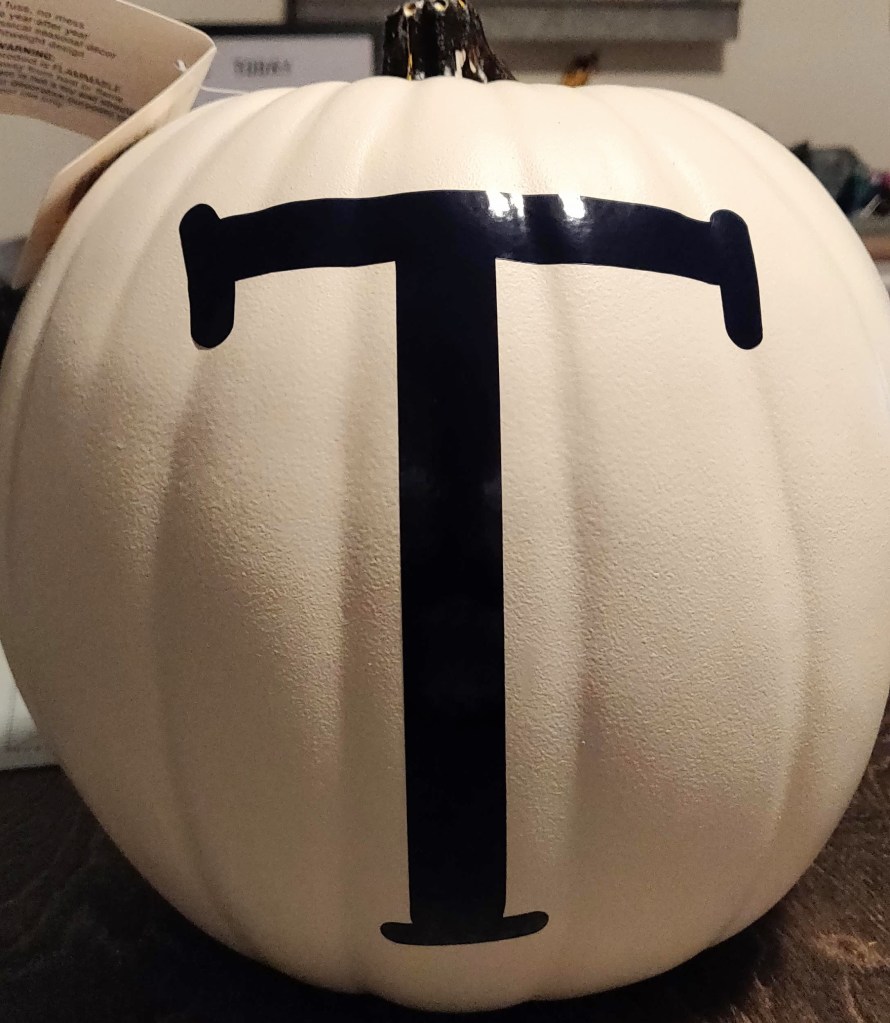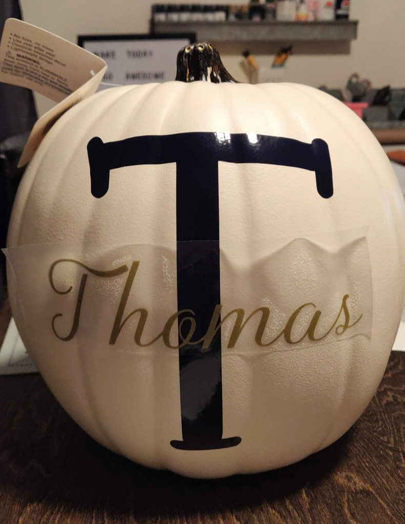 I cut my big T first, I went with 6 inches tall and used Mellow Soldier font which came in a free font bundle on thehungryjpeg.com. I wish I would have chosen a font with a straight bottom on the T, this font angles it so I feel like in some of my pics it looks crooked, I’m a little too critical sometimes. When applying to the pumpkin I tried to choose the side that was flatter than the others so it would be less likely to bubble or wrinkle.