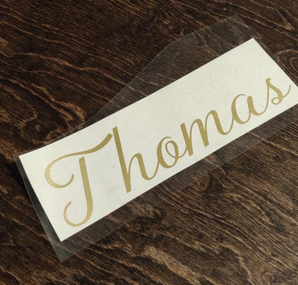 Next step was the Thomas. I will confess the longest part of most of my Cricut projects is deciding on a font. I didn’t have any I was really in love with, so I went and found some new ones to pick from, which added to the length of time I spent on this project. For some reason the letter T just isn’t pretty in all fonts, some it looks like an F, others it looks like a J…it’s the too critical side of me again. So after checking out fontbundles.net and many free fonts later I found the Christina font. I made this 6 inches wide and about an inch and a half tall.