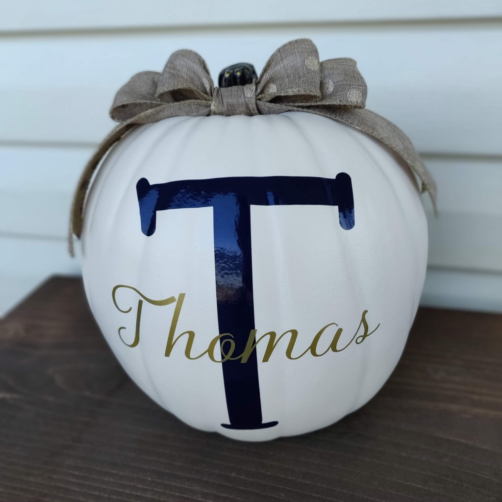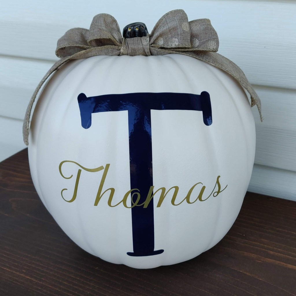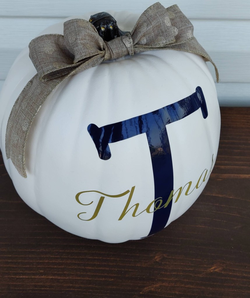 I have a Cricut, but if you have artistic ability (which I don’t), you could paint your pumpkin. I took the easy way out and did vinyl. The pumpkin is a 9 inch craft pumpkin from Michaels, I found mine on sale for $8 (regular price $20). I purchased 2 sheets of 651 vinyl (also from Michaels) in Navy and Gold. I had the ribbon on hand, it was in the clearance section at Hobby Lobby and I can’t pass up on clearance, burlap or ribbons, so all 3 combined and it was a definite purchase!